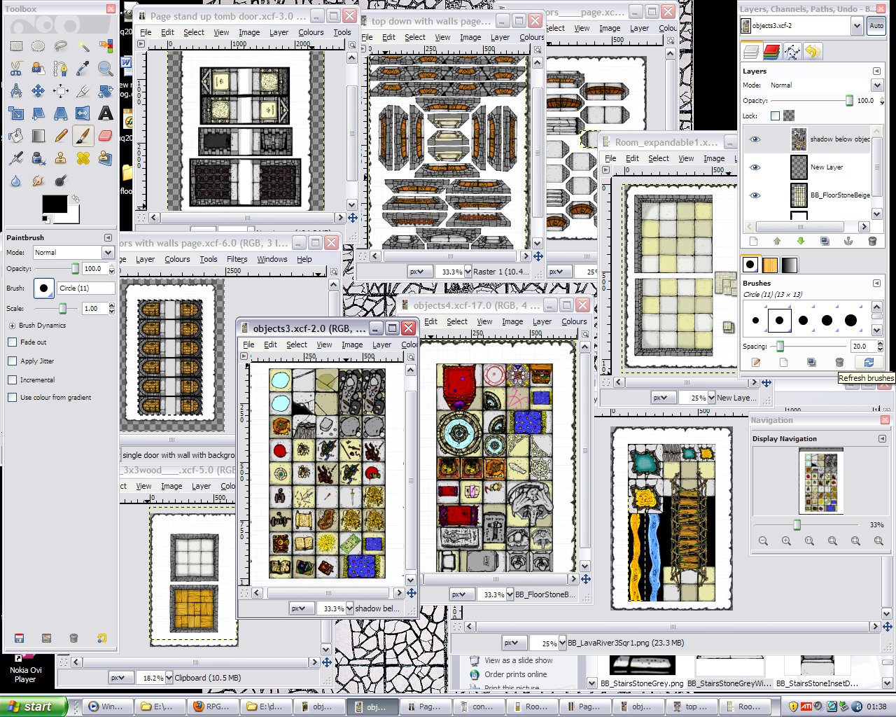 I'm amazed at how much things have had to be reworked. A bizarre occurrence is a difference in many of the files between 96dpi and 100 dpi - which isn't so bad with smaller rooms and objects but difference multiplies - - not to mention matching that up with the more recently 300DPI scans. My earlier scans and work was all prepared in Paint Shop Pro 8 (or "crash engine" as I like to think of it) but now I'm a GIMP 2.6 man. (I'd better be careful who I'd say it to). I think I'm going to have to have some free appendices to the main pack, for essential forgotten graphics, as the weeks progress, I'll suddenly remember something that all dungeons have, like pillars or doors ... d'oh. The good news is that there's lots of "objects" - I have a deal with Rusty Axe that I can still use all the art I prepared for the Dungeon Demon Printer Friendly Art Packs - some of it is practically drag n drop. Brain just broke. Fancy a sneak peak? screen_bb_08_2010.jpg And I wonder why I can't sleep at night ... (Apologies to people who've received this message twice on email notification because I like to re-edit and yet I still leave typos! ;) ) |