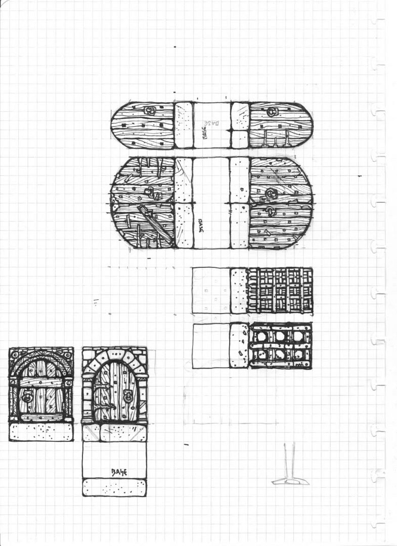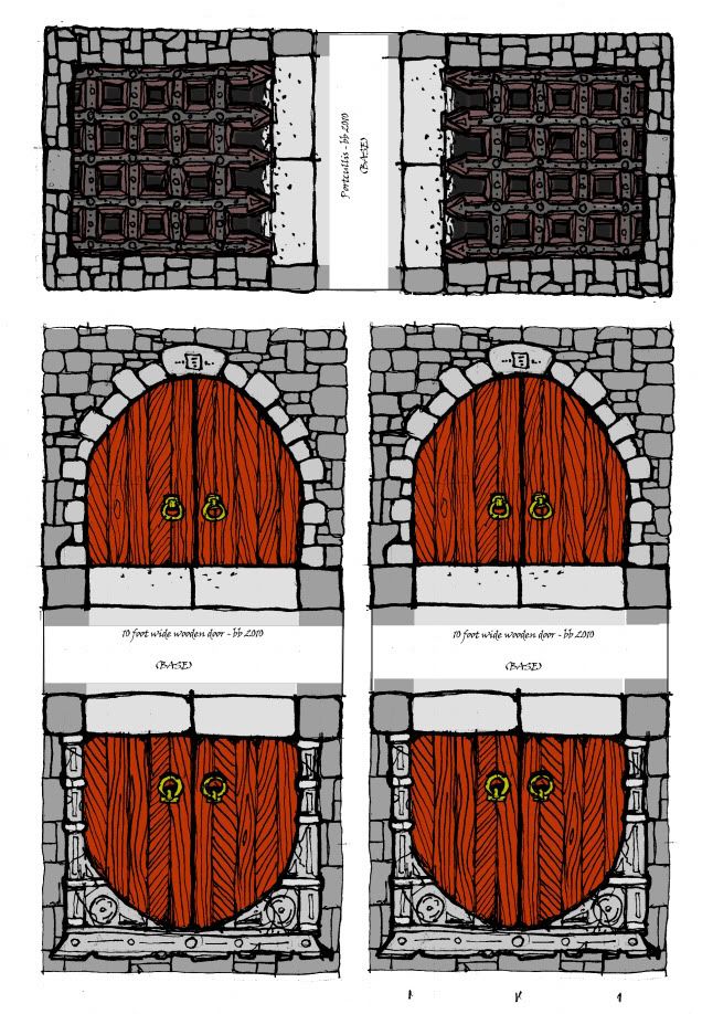All the doors looks great and the pillared ones are very nice The Skeletal Archway is awesome and a good starting point for an Undead or Demonic themed set of floor plans. I'd also consider doing an alternate version with a swirling portal in it too. I will hopefully have new Ink Cartages soon and be able to do some test printing myself and try fitting the stand-up doors to plastic bases like I mentioned a few posts ago I think (mechanically at least) you needn't worry too much about representing where the doors are as long as it's clear to players that doors occupy a square on the grid. The important thing is that the art you've done for the top-down door makers blends in nicely with the walls and looks awesome when laid out on the table. Representing anything 3 dimensional in 2 dimensions is always going to be tricky, especially when representing something as complex as architecture. Doors and wall thickness has always been a problem for dungeon design due to the grid system upon which they are mapped and designed. Most dungeon sets have one of 2 different types of wall, 5 foot thick (a square's width) or 'paper thin' (not necessarily paper thin, but certainly ridiculously thin – this is the kind of wall you represented by a line between squares). 5 foot thick walls are almost certainly the most realistic and work well with any rule set your care to use, the thing to remember about your set is that it's only the perspective of the walls that is representational not the space they take up on the grid . Therefore it's safe to assume that (because doors are rarely 5 foot thick) the door marker represent a door (much thinner that the wall surrounding it) sitting in the centre (or at one end) of a doorway that passes through a 5 foot thick wall and thus is a square with a object (the door) occupying it. An upright door in the centre of a 1 square wide base side steps this problem of representation, by being a 3D (-ish) representation of where exactly the door is, but causes it's own set of problems when it comes to placing miniatures in the doorway. (Please don't think this means I don't like the top-down doors, I think they look great!) 'Paper Thin' walls are of course not very realistic, because they are merely a line that blocks movement and don't actually take up any space. But very easy for a lazy GM to draw out on their battle-mat or the author of a pre-written adventure to draw on their map grid (after all what could be easier than a single line?). Unfortunately a lot of dungeon systems (and maps in rulebooks) suffer from 'Paper Thin' walls (the maps from AHQ and many other games would be impossible to accurately recreate in 3D) but most players and GM's don't seem to notice. This may be because people are used to seeing thin plasterboard interior walls no more than 4 to 6 inches wide in modern buildings and don't give much thought to how thick a stone wall in a dungeon or castle would realistically be (I may be over analysing things here, I am aware that the last sentence speaks volumes about the way I think). There is also a lesser seen 3rd type of wall, the 'half-a-square' wall sometimes seen in 3D dungeon sets (Dwarven Forge being a good example) this type wall is fairly realistic, but causes problems for most (if not all) rule sets because of the problems caused by having half a square on the table (is it a square or not? Can I enter it? Can only small creatures enter it? Ect) To sum up by ramblings so far: the top-down doors look good and any arguments about what they represent are easily solved by explaining that they are a hole in the wall with a door in it. Personally I'd use the top-down representation of the doors when creating maps for a Pre-written Adventure (or even an after action report) and use the up-right doors when playing games on the table top.
